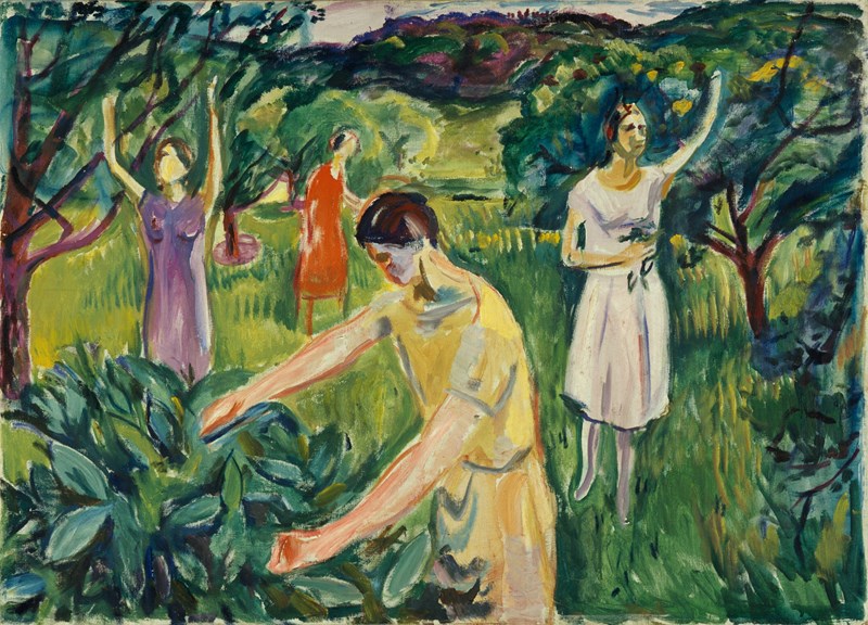 We often think of gardens as an outdoor room next to the house. In this garden, nature is more than just the background – it is bursting with life, greenness and growth. By contrast, the mood among the women seems strange and melancholy. There is not much fruit for them to gather in this orchard.