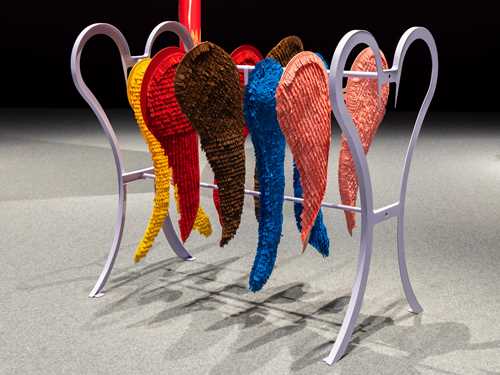 In Tenvik’s exhibition, the human characters are given new names based on their Greek meanings: Mr. Convincing (Pisthetaerus) and Mr. Hopeful (Euelpides). They are represented in the exhibition through steel sculptures, painted in pastel blue and light green, and adorned with wigs and textiles. They resemble the sculptures in Aloof Periwigs, but are more clearly human with pronounced facial features, feet and hands, rather than functional objects standing in for human form. Their world is marked by an ornate and multi-coloured gate at the entrance to the installation. Metal is a prominent material in this initial section of the exhibition, including a clothes rack with wings, representing the stage before the humans’ ascendancy into the world of the birds. The aluminium wings are clad in brightly-coloured plumage made from deconstructed shuttlecocks. In a departure from her earlier brightly-lit installations at Loyal and Anat Egbi, the lighting at MUNCH is more atmospheric and theatrical, and the walls painted a dark plum purple.
